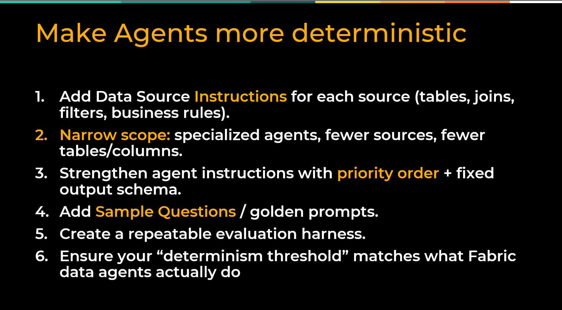 Fabric data agents are probabilistic by nature. They use statistical reasoning to determine the most likely answer to a question. Business users, on the other hand, expect deterministic answers — the same question returning the same result every time. Well-crafted agent instructions are the primary lever for closing that gap. Agent instructions are a configuration layer where you provide the model with context, priorities, constraints, and behavioral guidance before it ever answers a user’s question. Think of them as the standing brief you would give a new analyst on their first day. Here is what matters, here is how we define things, here is what to do when a question is ambiguous, and here is what is out of scope. Good instructions establish priority order when multiple data sources are available, define how specific metrics should be calculated, and specify output formats where consistency matters. Fabric data agents also support sample questions with pre-defined queries. For your most critical business questions, you can specify the exact SQL, DAX, or KQL query you want the agent to execute, removing the probabilistic element entirely for those scenarios. Treat your instructions as a living document and refine them as you learn how users interact with the agent. Here’s what to do:- Write instructions that establish data source priority, metric definitions, and output format expectations