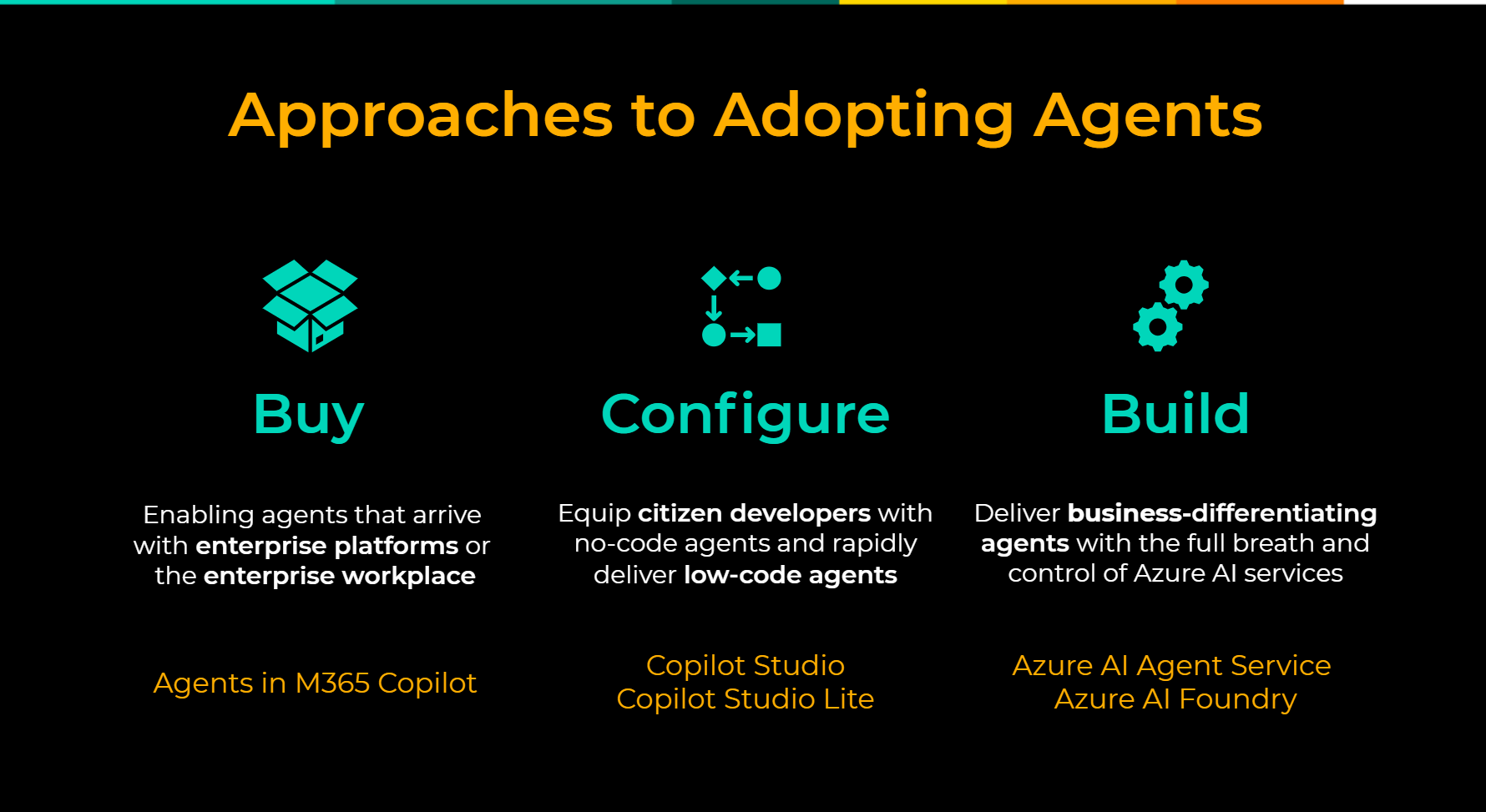 For leaders, the challenge is not just whether to start with agents, but how. Microsoft provides three clear on-ramps: buy, configure, and build. Each represents a different entry point depending on your organization’s maturity, technical depth, and strategic goals.